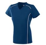 100% polyester wicking smooth knit * 92% polyester/8% spandex wicking pinhole mesh back and side panels * Odor-resistant * Wicks moisture away from the body * Ladies fit * Heat sealed label * Self-fabric V-neck collar * Set-in sleeves * Breathable pinhole mesh shoulders, side panels, and back * Contrast color piping on front and back of shoulders and side panel